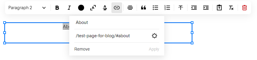 To do this, navigate to the desired page or text where you want the link to appear and create it as you typically would. However, when you reach the 'link' section, instead of simply adding the page, use the page URL where the code is located in step 1, add /#yoursection to the end of the URL and click save. Example below.